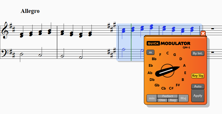 We created his custom tool, QuickModulator, which allows him—by just turning a knob—to change the current key, transpose the written music, and insert the corresponding key signature.