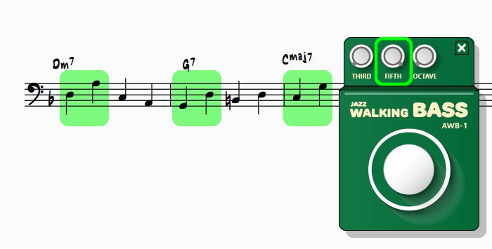 Select which interval you prefer to use at the beginning of each bar. Use the three knobs to prioritize the third, fifth, or octave.